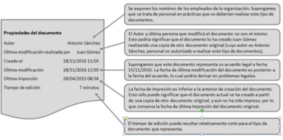 La siguiente figura muestra un ejemplo del impacto que podría causar el exponer cierta información almacenada en los metadatos de un documento.
