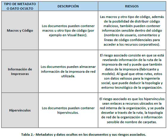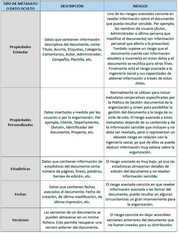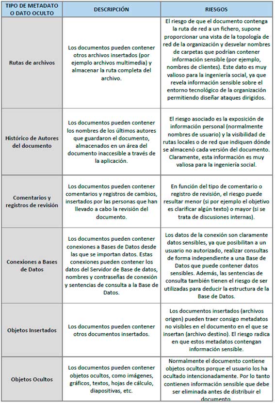 A continuación, se incluye una tabla con algunos metadatos y datos ocultos que pueden estar presentes en los documentos y sus riesgos asociados.